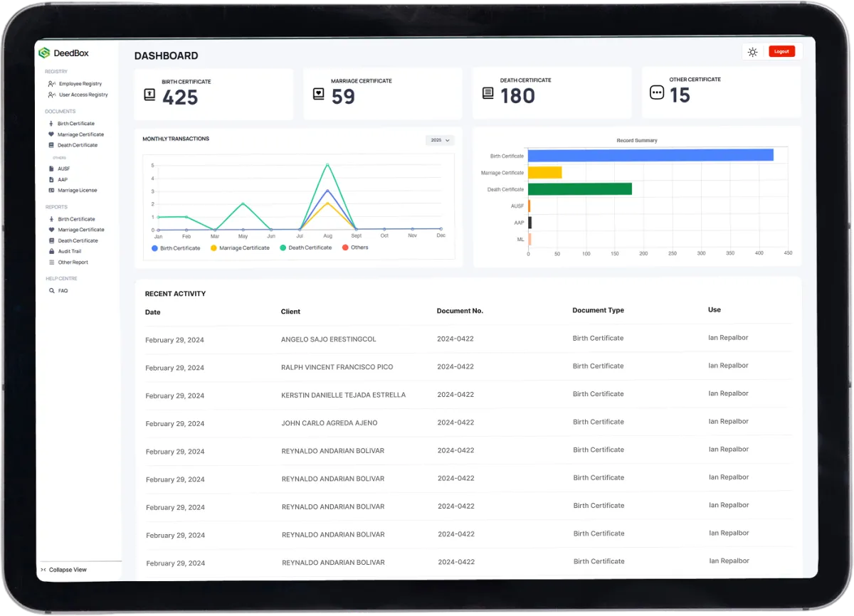 A secure repository system for civil registrars. Store, manage, and retrieve legal documents like birth certificates, marriage licenses, and death records with ease.